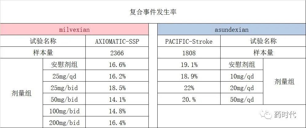 M药的数据略好一些,50mg和100mg bid(每日两次)组患者的主要疗效终点发生率在数值上较低,但无明显的剂量反应关系;A药更尴尬一点,与安慰剂相比,并不能降低隐匿性脑梗死或复发性症状性缺血性卒中的复合事件终点,且主要疗效结局无剂量依赖关系。