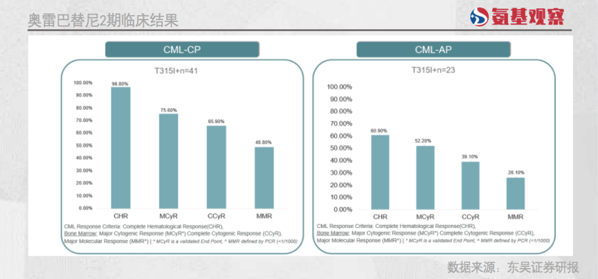 其次,奥雷巴替尼在立项之初就定位全球,具有Best-in-class潜力。如下图所示,奥雷巴替尼针对伴有T315I突变的TKI耐药的CML慢性期(CML-CP)及加速期(CML-AP)患者的两项关键注册2期临床试验,均展现了突出的治疗效果。安全性方面,没有竞品帕纳替尼严重血栓副反应。