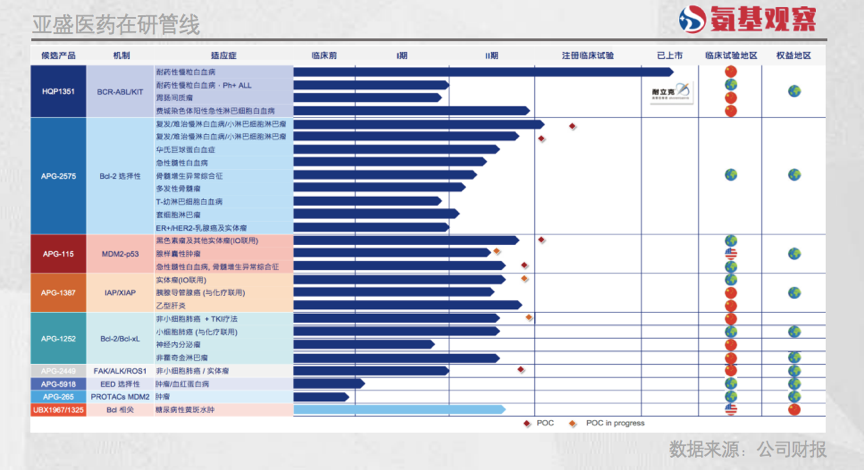作为全球这一领域研发领先的公司,亚盛医药已构建丰富的管线布局。如下图所示,亚盛医药针对包括Bcl2、IAP及MDM2-p53三条关键细胞凋亡路径推进多个产品临床,是全球唯一一家在3种细胞凋亡路径关键蛋白领域均有布局的创新药公司。