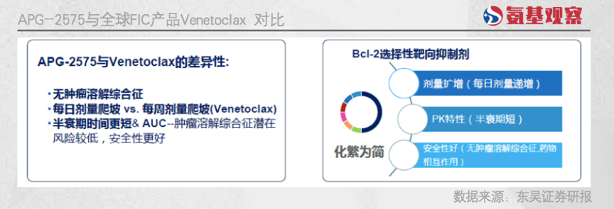 而APG-2575是继Venetoclax之后全球层面开发最快的Bcl-2抑制剂,明显遥遥领先于其他药企,并且展现“Best-in-class”的潜力。根据其目前披露的多项临床数据来看,与Venetoclax相比,APG-2575具有疗效相当且安全性好的特点。