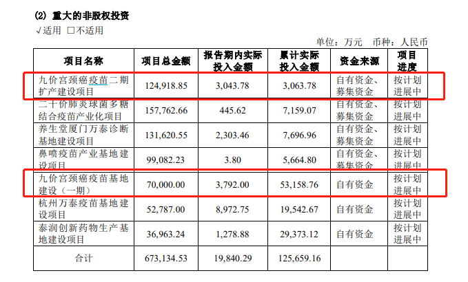 此外,万泰生物的九价宫颈癌疫苗二期扩产建设项目、九价宫颈癌疫苗基地建设(一期)项目均在按计划进展中。