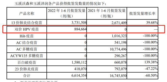 值得注意的是,今年3月,沃森生物子公司玉溪泽润二价HPV疫苗于3月获得《药品注册证书》,5月首批产品获得《生物制品批签发证明》,上半年,玉溪泽润二价HPV疫苗共获得批签发884664剂。