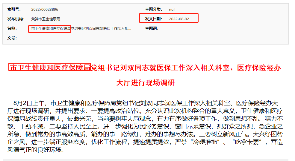 事实上,黄骅市卫健及医保局官网的各项通告上显示,至少在2022年8月2日,该局的名称就开始在官网上出现。如下截图所示: