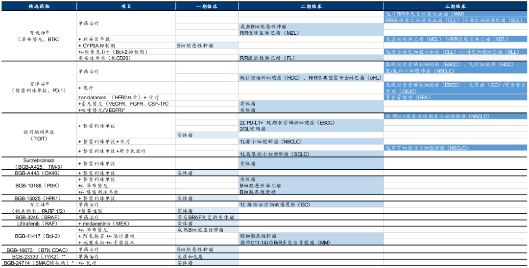 还有多款处于早期临床阶段的潜力药物,包括surzebiclimab(TIM3抗体)、BGB-10188(PI3K抑制剂)、BGB-15025(HPK1抑制剂)、BGB-16673(靶向BTK的CDAC)、BGB-23330(TYK2抑制剂)及BGB-24714(SMAC模拟物)。