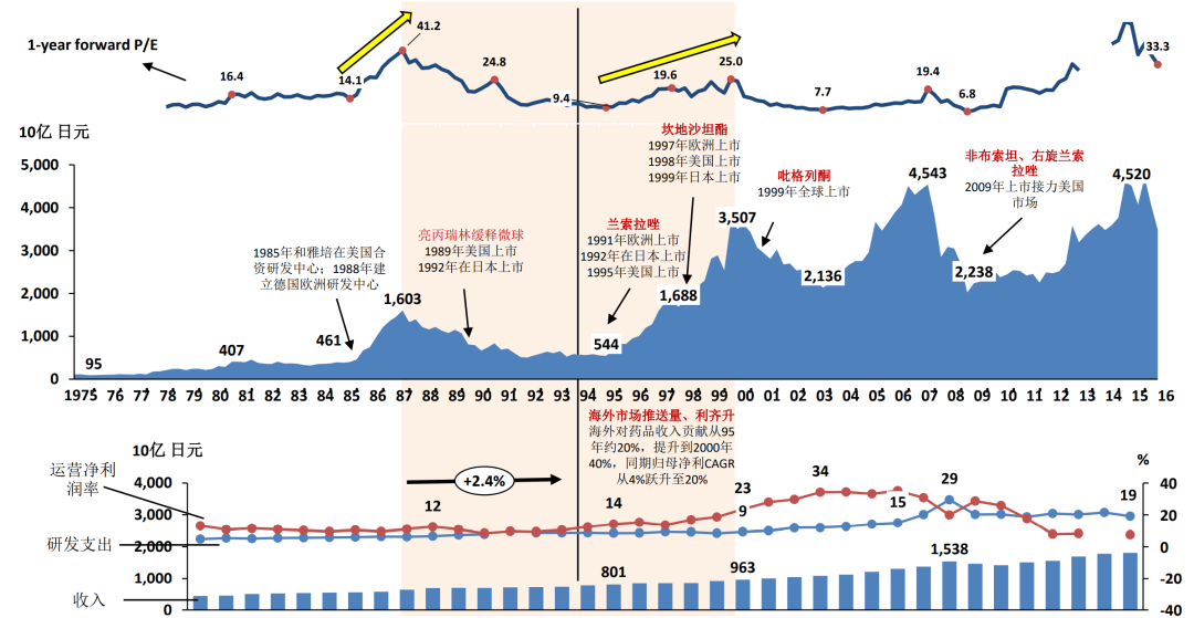 2007年,武田制药海外收入开始超过日本国内,四大全球级重磅产品最高峰2010年贡献约100亿美元收入。4个重磅产品虽然不是first-in-class,却尽量做到同类最佳,而且目标患者基数庞大。