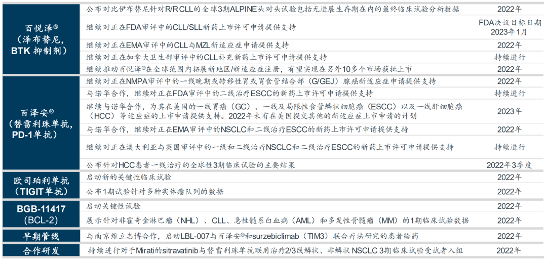全球入组受试者超过16000名,其中约半数在海外。超100项临床试验,正在超过45个国家和地区开展,其中包括超过30项关键性或潜在注册可用临床试验。泽布替尼10项注册性临床试验,覆盖超过25个国家和地区,超过4500例受试者入组,其中超过3600例受试者来自于海外。替雷利珠单抗22项注册性临床试验,涵盖超过20个国家和地区,全球性临床试验已超过11000例受试者入组,为国产PD-1中全球入组患者最多的,其中超过3800例受试者来自于海外。