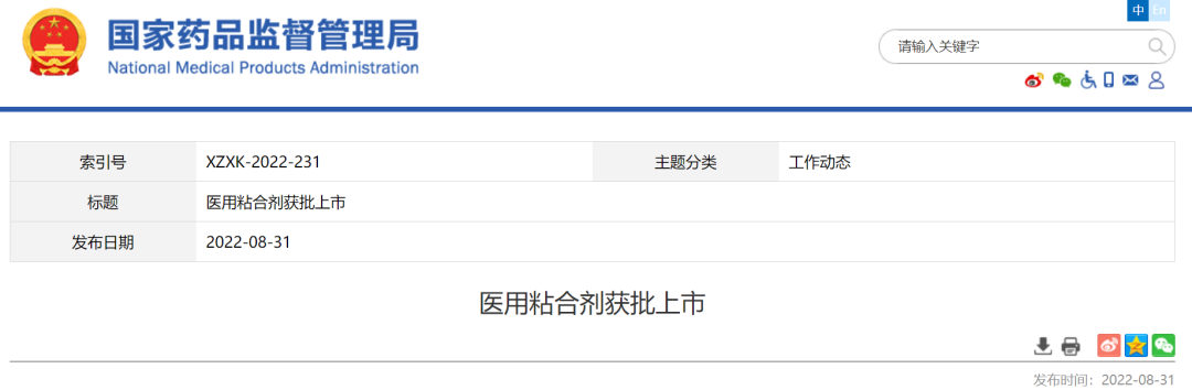 医用粘合剂是国内首个用于封合肺实质漏气的粘合剂医疗器械。