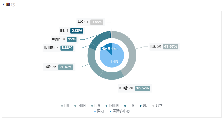 可视化分析显示,8 月份开展的临床中以早期临床试验(I 期 + I/II 期)为主,占到 58.34%;III 期临床亦有 18 项开展,占到 15%。地区分布来看,16 项(13.33%)属于国际多中心临床试验,其中 4 项有中国药企参与。