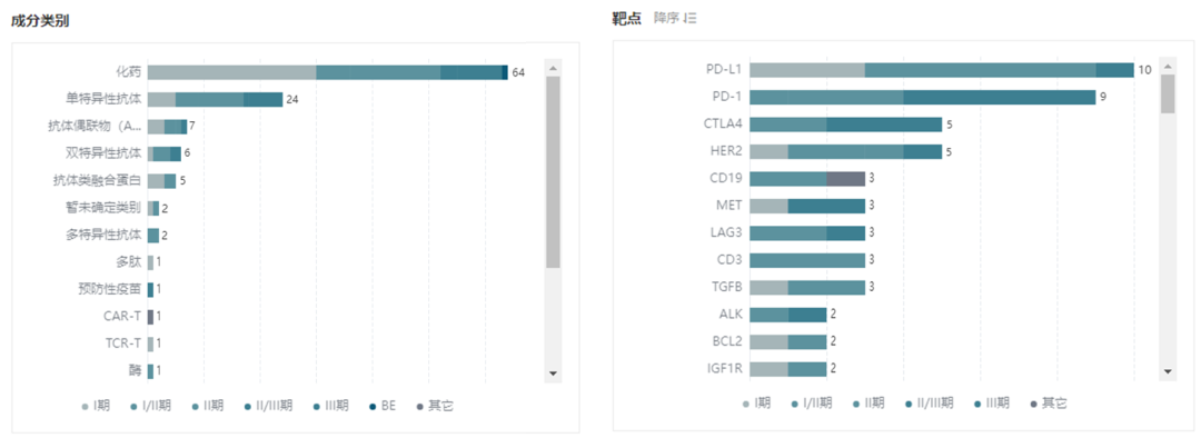靶点分布上看,多数临床试验仍然聚焦热门靶点如 PD-(L)1、CTLA4、HER2、CD19、LAG3 等,不过这些热门靶点临床试验多数处于后期;成分类别分布中化药和单抗自然是一骑绝尘,不过 ADC 已经爬到第 3 位,双抗、抗体融合蛋白也不甘落后,三者代表的下一代抗体新药正呈蓬勃发展之势。