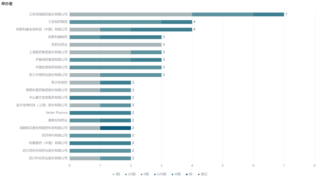 8 月份,共 8 家药企在国内登记了至少 3 项创新药临床试验。其中 TOP3 分别为:恒瑞医药(7)、三生制药(4)、阿斯利康(4)。