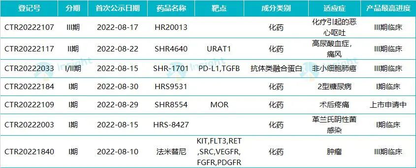 以下为恒瑞 8 月启动的创新药国内临床试验列表: