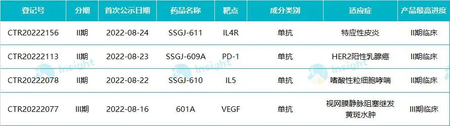 三生制药同样有 4 项新药临床试验登记。在 8 月份,该企业临床进展迅速,3 个新药都推进到了新的阶段:SSGJ-611、SSGJ-610 进入 II 期临床开发,601A 首次启动 III 期临床。
