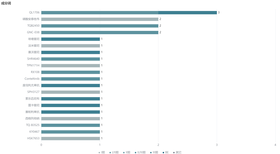 8 月份有 4 个新药登记了不止一项临床试验,成为本月品种 TOP3:齐鲁制药的 PD-1/CTLA4 单抗复方 QL1706、东阳光药丙肝新药安泰他韦、正大天晴 PD-L1 单抗 TQB2450、百利药业 CD19/CD3/PD-L1/4-1BB 多特异性抗体 GNC-038。
