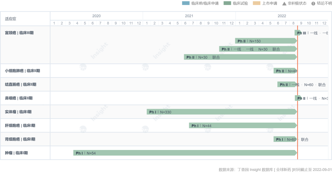 据 Insight 数据库显示,QL1706 在 2020 年首次启动临床,目前已经针对宫颈癌、小细胞肺癌、结直肠癌、鼻咽癌、肝细胞癌、肾细胞癌都开展了临床研发。