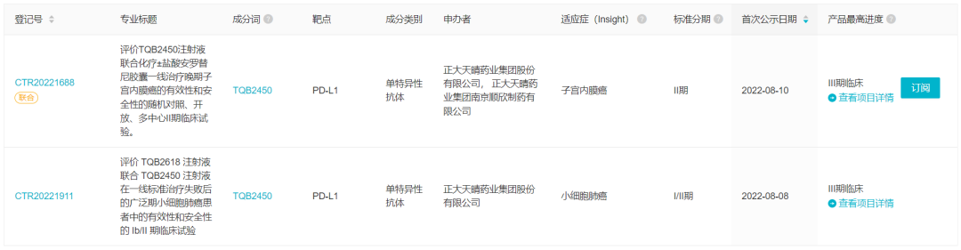 TQB2450 是正大天晴开发的 PD-L1 单抗。8 月份该药启动了两项新的临床试验,一项 II 期临床联用自家管线安罗替尼一线治疗晚期子宫内膜癌(CTR20221688),一项 Ib/II 期临床联用自家 TIM3 单抗 TQB2618(CTR20221911)。