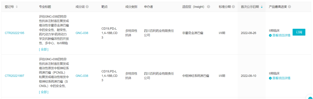 GNC-038 是百利药业研发的 CD19/PD-L1/4-1BB/CD3 四特异性抗体,也是首个进入临床的四特异性抗体。该药针对非霍奇金淋巴瘤开发,2020 年 10 月首次启动临床,目前已经登记了 4 项临床试验,其中两项都在 8 月份启动。