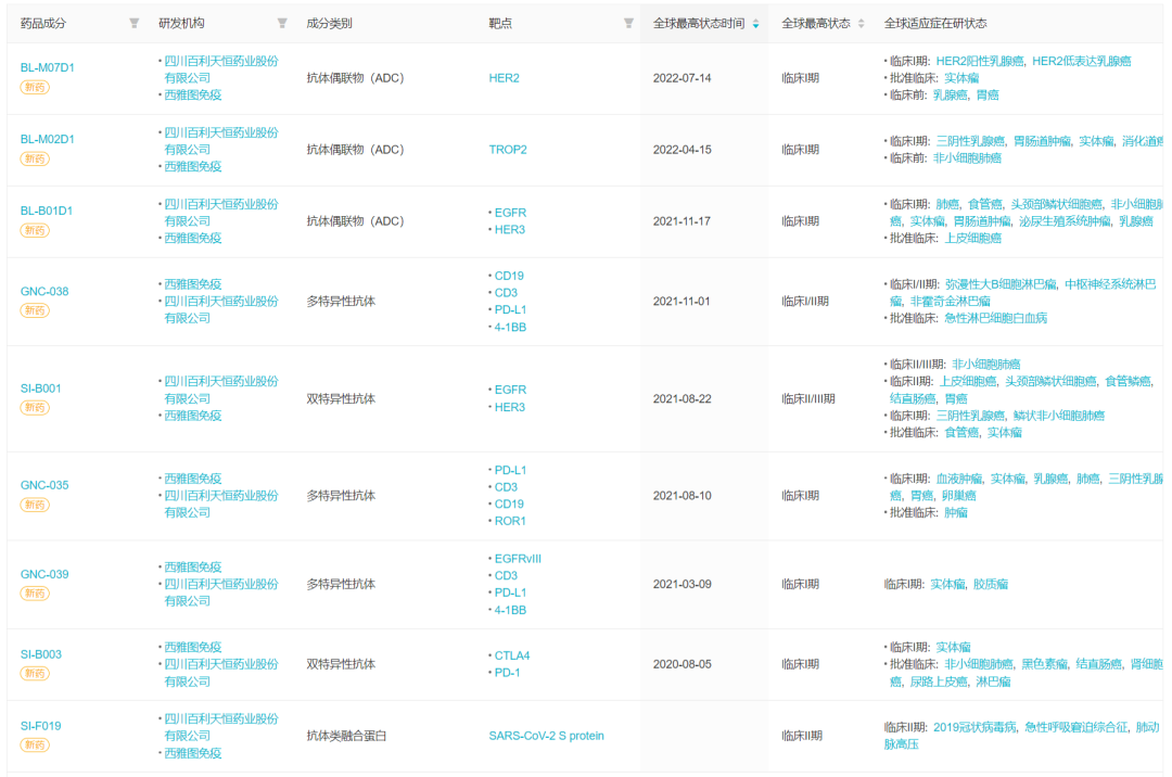 目前,来自 Systimmune 的 9 个新药项目已经在国内进入临床开发阶段,其中包括另外 2 款来自于 GNC 平台的多特异性抗体 GNC-035(ROR1)、GNC-039(EGFRvIII)、3 款 ADC,以及其他抗体药物。
