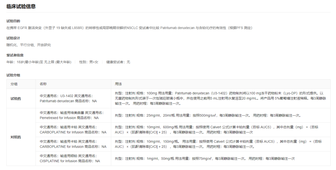 这是国际多中心临床 HERTHENA–Lung02 研究的中国部分,在携带 EGFR 激活突变(外显子 19 缺失或 L858R)的转移性或局部晚期非鳞状 NSCLC 受试者中比较与含铂化疗的有效性,主要终点为 BICR 评估的 PFS。试验由吴一龙教授牵头,计划在国内 20 个中心招募 84 例患者。
