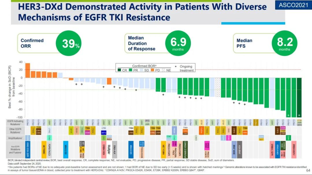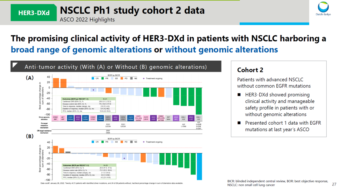 U3-1402 的首发适应症为 NSCLC,在去年和今年的 ASCO 中,第一三共分别公布了 1 期临床队列 1 和队列 2 的数据,前者评估了 U3-1402 针对 EGFR 突变患者的临床数据,取得了令人惊艳的结果。尤其是对于曾接受 EGFR-TKI 治疗后各类耐药的患者,其疗效数据均与其他患者相似,这意味着 U3-1402 有望克服 EGFR-TKI 耐药。