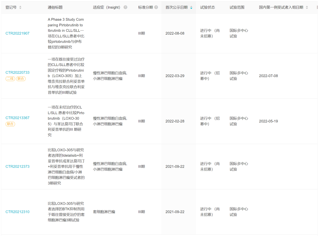 8 月 8 日,据 Insight 数据库显示,礼来在中国启动了新一代 BTK 抑制剂 LOXO-305(Pirtobrutinib,吡托布鲁替尼)头对头伊布替尼治疗慢性淋巴细胞白血病/小淋巴细胞淋巴瘤(CLL/SLL)的 III 期开放标签、随机临床研究(登记号:CTR20221907)。这是全球多中心 III 期临床 BRUIN-CLL-314 研究的中国部分。