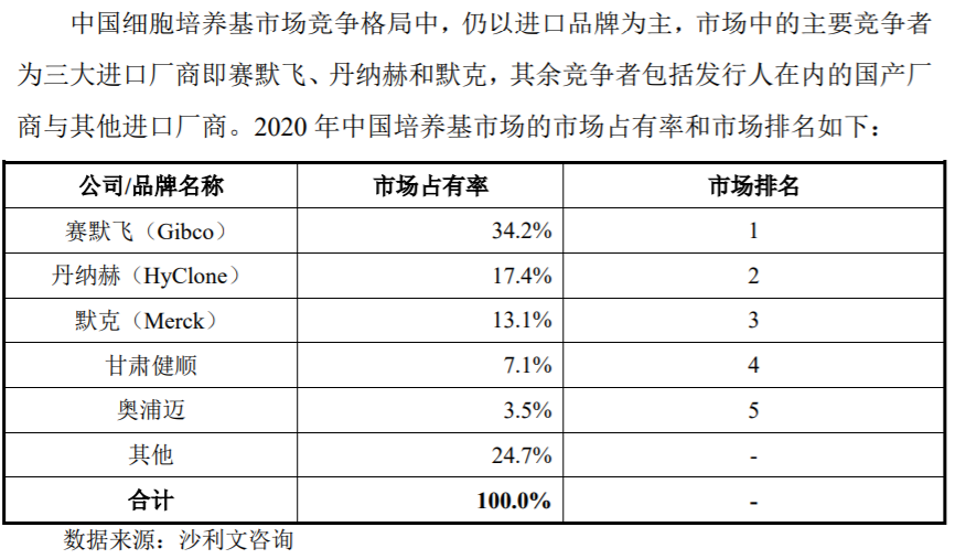 中国细胞培养基市场仍以进口产品为主,赛默飞(Gibco品牌)、丹纳赫(HyClone品牌)和默克三大供应商占到三分之二的市场份额,国产化替代空间巨大。国产细胞培养基厂商中,甘肃健顺、奥浦迈占比较大,其他的供应商还有中山康天晟和、上海倍谙基、源培生物、沃美生物、迈邦生物、多宁生物等。
