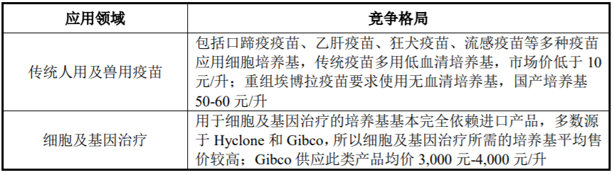 抗体和蛋白药物的细胞培养基,进口产品一般在200-300元/升,国产产品一般在100元/升左右。细胞和基因治疗的培养基几乎完全依赖进口,售价一般在3000-4000元/升。