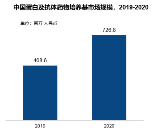 根据咨询机构的数据,2020年中国抗体和蛋白药物细胞培养基市场规模为7.27亿元左右。考虑到中国生物医药从2015年的爆发开始,2019年开始才陆续进入商业化阶段,未来几年仍将高速增长的趋势。