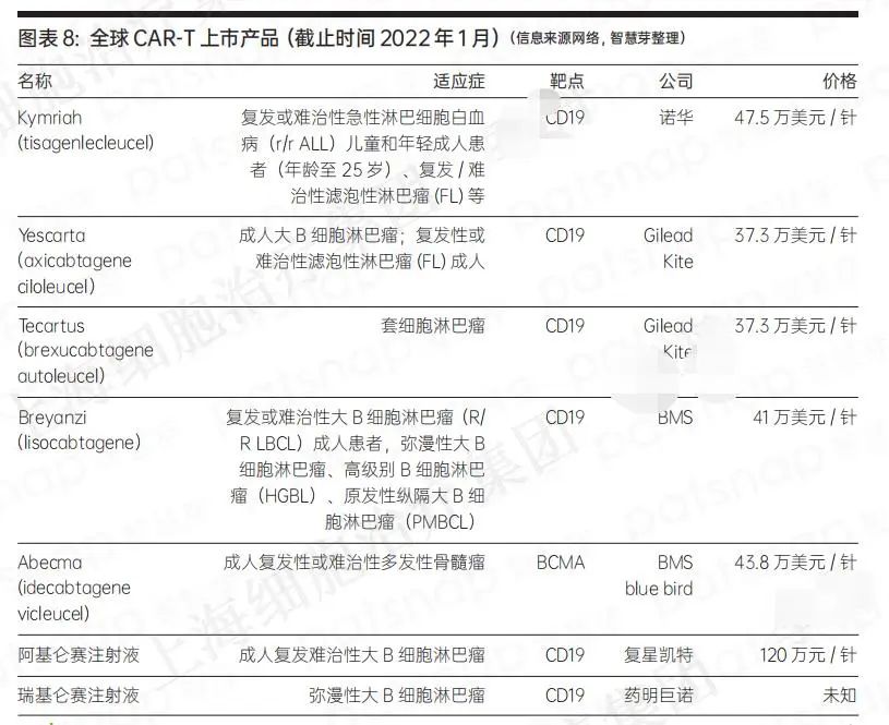 全球已上市 CAR-T细胞疗法产品