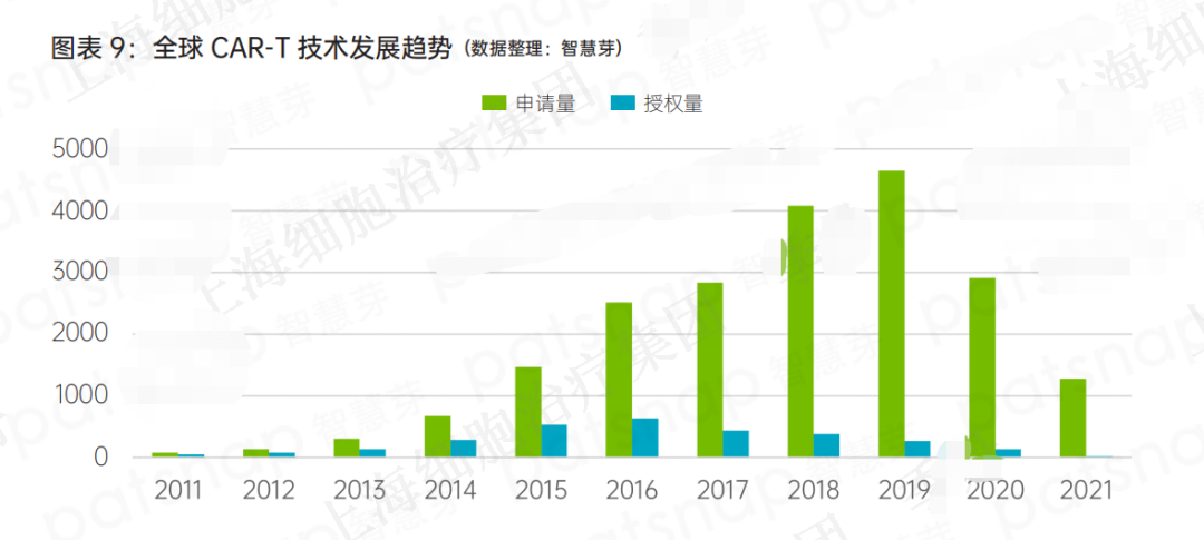 通过关键词在智慧芽全球专利数据库中检索,相关专利量约 2.1 万件。结合 CAR-T 技术发展趋势来看,1993 年诞生第一代 CAR-T 技术但临床效果并不是很理想,2002 年与 2010 年分别诞生第二代和第三代 CAR-T 技术,促进技术发展并取得临床成功,2013 年随着第四代 CAR-T治疗技术的诞生,癌症免疫疗法被评为“年度突破疗法”,此后,相关技术研究快速爆发;2017年诺华产品获批,作为行业里程碑事件,在带动研发热度的同时专利申请量也达到巅峰。(如图表 9)