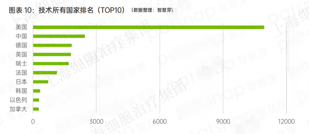 CAR-T 疗法的临床研究集中度高,主要集中在美国和中国。其中,美国专利申请量为 1.1 万件位居榜首,中国虽然排名第二位,但是申请量仅有 2600 多件,虽然领先于其他欧洲国家和日本,但是相较美国的技术发展和专利储备差距仍然非常大。(如图表 10)