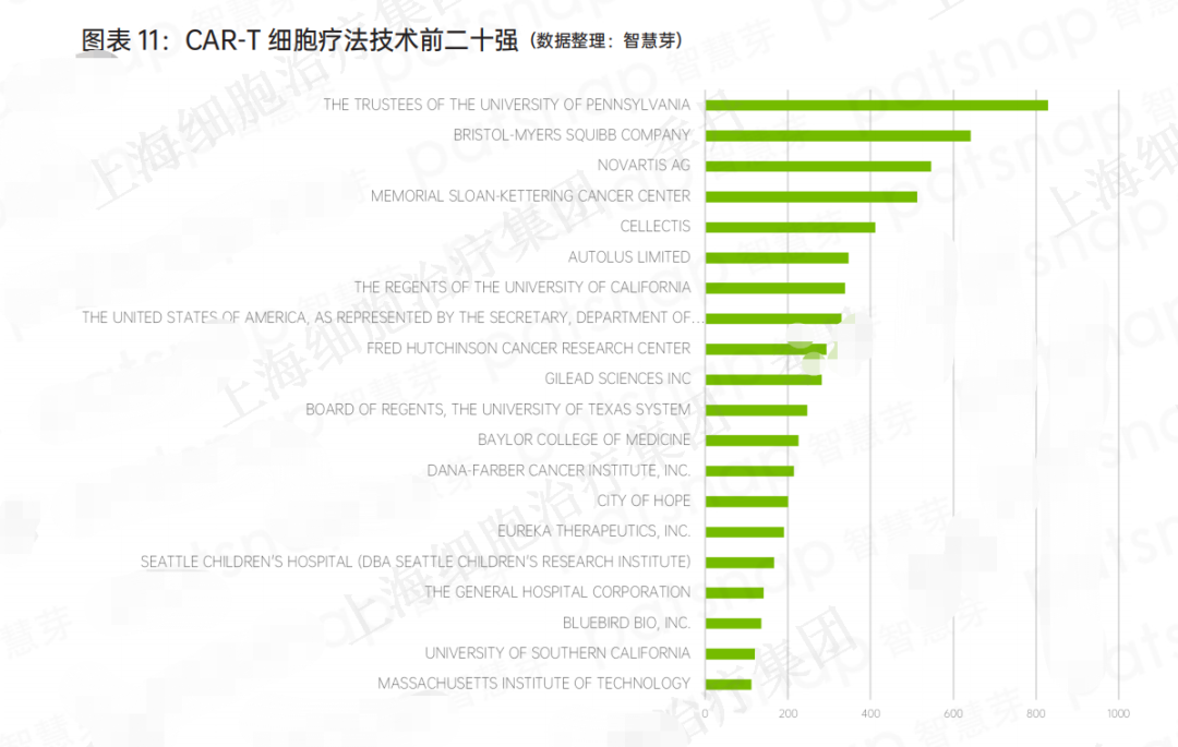 基于以上,在分析专利权利人时基于并购关系对申请人进行适当合并处理。可以看出除了药企外,宾州大学、纪念斯隆 - 凯特琳癌症中心等研究机构也有很强的技术储备。(如图表 11)