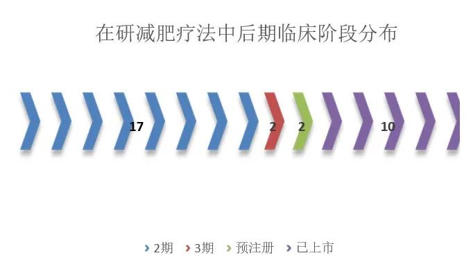 内容概要据不完全统计,目前共有31款处于临床2期、3期、预注册及已上市的在研减肥疗法。其中2期17款,3期2款,预注册2款,已上市10款。
