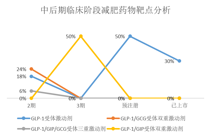 处于2期临床开发阶段的疗法靶点种类更加丰富,机制更为新颖,包括可控代谢加速器、神经肽YY5受体,IKKε/TBK1,激活素Ⅱ型受体等,3期及更高状态疗法靶点相对较为单一。