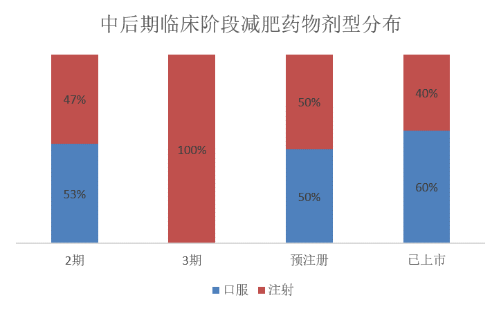 剂型:口服略多于注射,未来口服剂型发展趋势更佳
