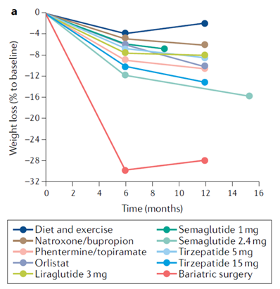 结果显示,已上市、预注册、3期减肥药物的平均减重百分比依次上升,药物的减重效果上限正不断提高。例如司格美鲁肽(semaglutide)的STEP 3a期临床试验结果显示,使用该药物治疗的肥胖患者平均体重减轻17-18% ,并且效果维持超过68周。7月26日,礼来公司在《新英格兰医学杂志》上发表了tirzepatide的临床3期试验SURMOUNT-1的结果,在第72周,与基线相比15 mgtirzepatide组患者体重减少22.5%(23.6kg),效果堪比减肥手术。