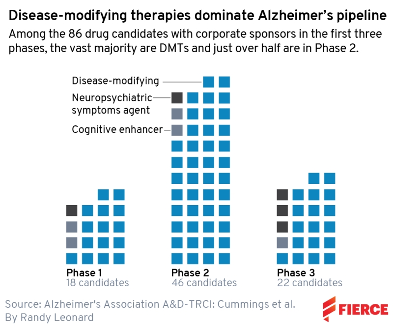 试图真正改变疾病的疗法占候选药物的83%,生物制药公司赞助了所有试验的一半和68%的晚期研究。生物疗法,尤其是单克隆抗体,占候选药物的34%,可以口服的小分子药物占66%。