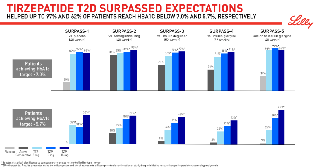 2022年5月,美国FDA批准Mounjaro(tirzepatide)上市。该次批准是基于III期SURPASS的项目积极结果,其大型III期项目由10项临床试验组成,计划招募超过13000例2型糖尿病患者,其中5项试验是全球性的注册研究。其中包括与司美格鲁肽1 mg、甘精胰岛素和德谷胰岛素的活性对照研究。这些研究评估了Mounjaro(5mg10mg和15mg)单独使用或与常用的糖尿病处方药物(包括二甲双胍、SGLT2抑制剂、磺脲类药物和甘精胰岛素)联合使用的疗效。SURPASS项目中,Mounjaro 5mg剂量平均使受试者A1C减少1.8%-2.1%,10mg和15mg剂量平均使受试者A1C减少了1.7%-2.4%。