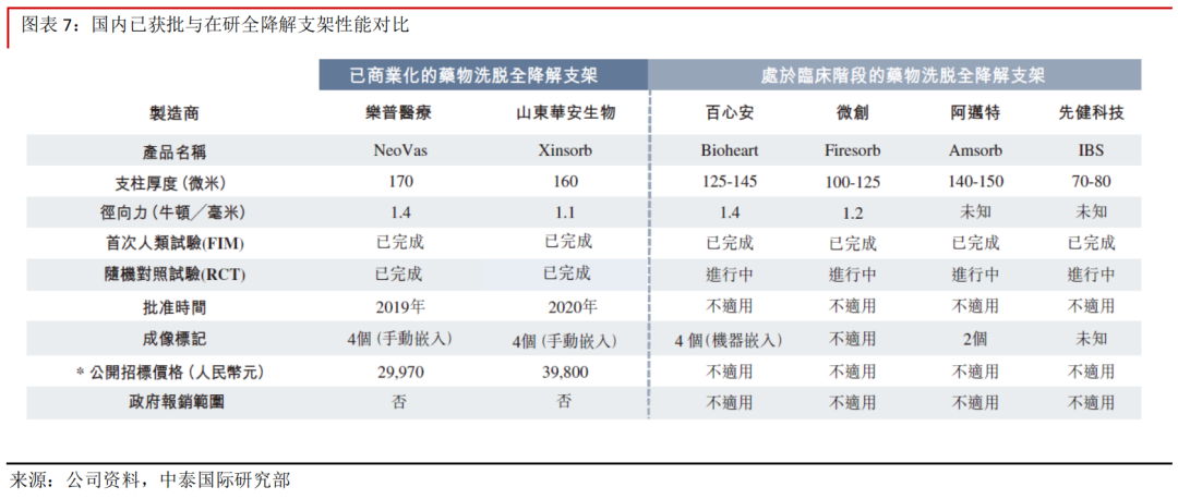 在全降解生物支架领域,百心安并不是第一个吃螃蟹的选手,乐普的NeoVas和山东博安生物的Xinsorb分别在2019年、2020年获批,并且乐普医疗已经在可降解支架、载药球囊的商业化取得了较好的先发优势(合计收入超7亿);同时,从在研的4家企业研发进度看,微创更早于公司开始单臂试验,预计两者未来获批时间相近。