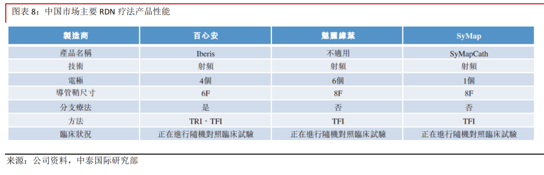 介入治疗高血压最先由巨头美敦力提出,目前美敦力的产品仍在全球进行临床试验以证明有效性(美敦力曾在部分地区临床试验得出不积极的结果);而在中日两国的RDN市场,处于临床阶段的只有百心安、魅丽纬叶、信迈医疗三家。