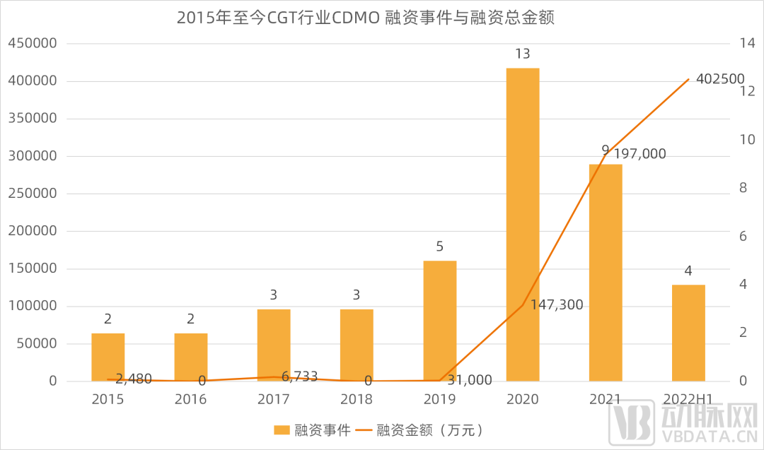 从上图可以看到,自2015年开始,CGT CDMO领域融资一直保持上涨态势。其中,2020年可以看作是CGT CDMO市场的转折点——相比2019年,2020年的融资事件数量是2019年融资事件数量的2倍多,融资总额是2019年的近5倍。(由于部分企业融资未透露具体金额,因此存在有融资事件存在但融资金额为零的反常情况。)