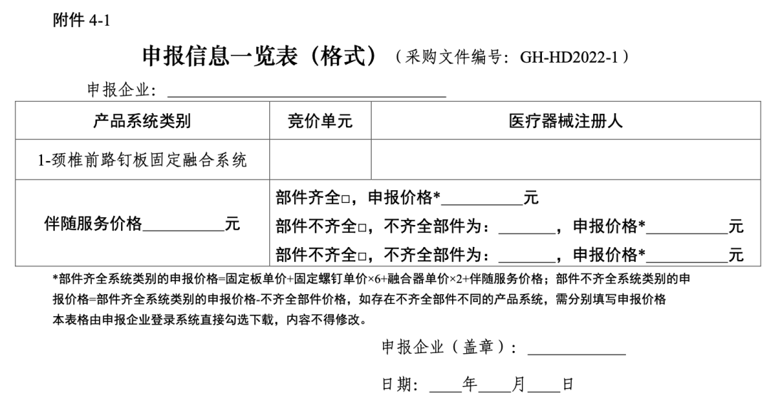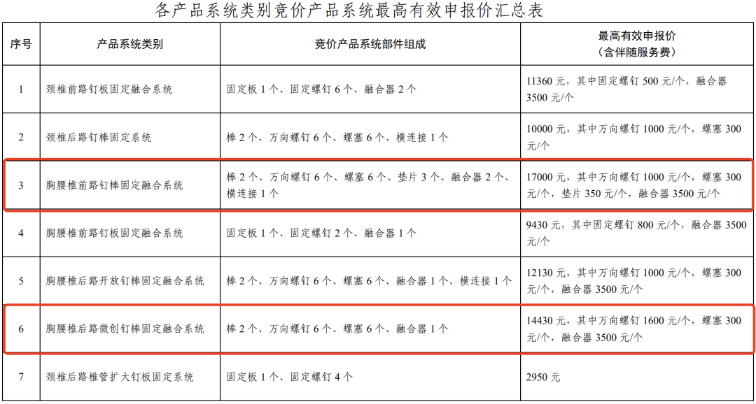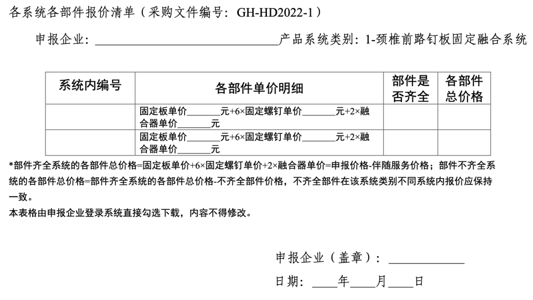 在每个竞价组中,企业按系统报价,具体包括系统价格(含产品系统配送费用、配套工具配送费用和配套工具使用费用)、伴随服务价格之和,并需要标明系统中每个部件的单价,脊柱用骨水泥不填报伴随服务价格。
