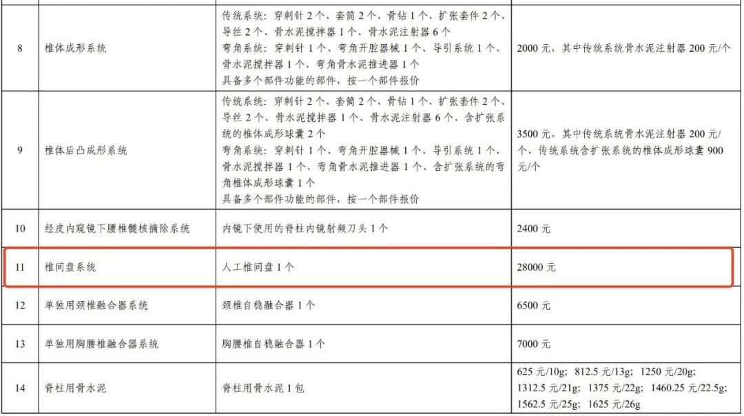 椎间盘系统价格最高,限价为28000元/个,按照需求量初步测算(下同),涉及市场金额约4186万元。