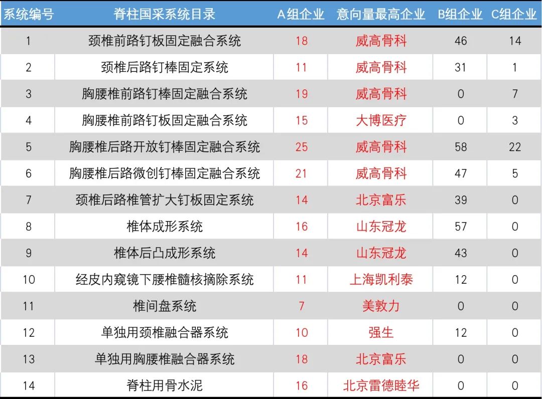 三,初步看来,本次国采,国内企业需求量显著多于外企,外企只在个别产品中意向量靠前,说明脊柱耗材国产化率并不差,其中威高骨科表现突出,在多类产品中拿下意向量“冠军”,或是本次国采赢面最大的选手。
