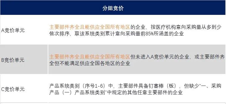 在竞价单元中,去年关节国采仅有AB两组,本次脊柱国采因为产品系统更加复杂,因此根据不同的情况设置了ABC三个竞价组,可简单理解为: