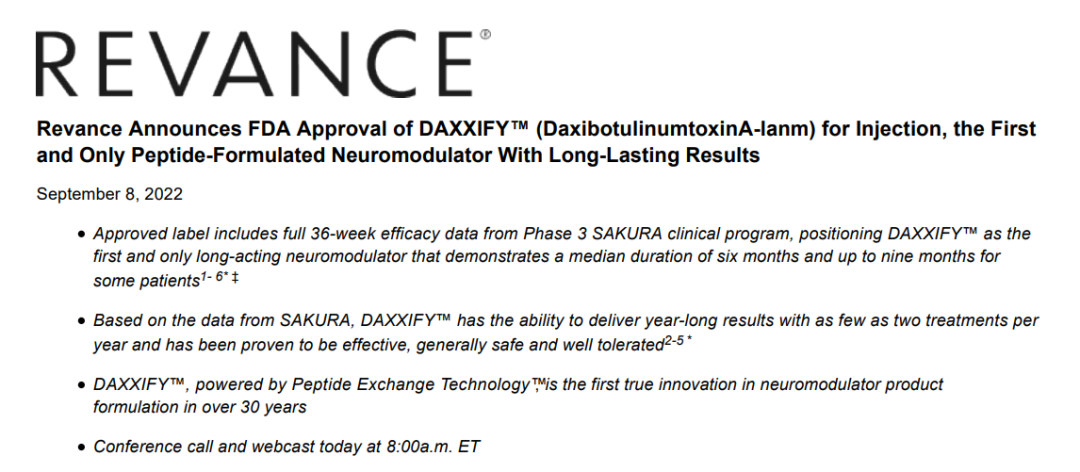9月8日,Revance Therapeutics宣布FDA批准Daxxify(注射用DaxibotulinumtoxinA-lanm)上市,用于暂时改善成人中重度皱眉纹(眉间纹)。Daxxify是基于该公司专有的TransMTs技术平台开发出的含有稳定肽制剂和高度纯化的A型肉毒杆菌毒素的新一代神经调节剂,是首款也是唯一一款长效肽制剂神经调节剂,不含人血清白蛋白和动物成分,除皱效果的中位持续时间为6个月,最长可达9个月。