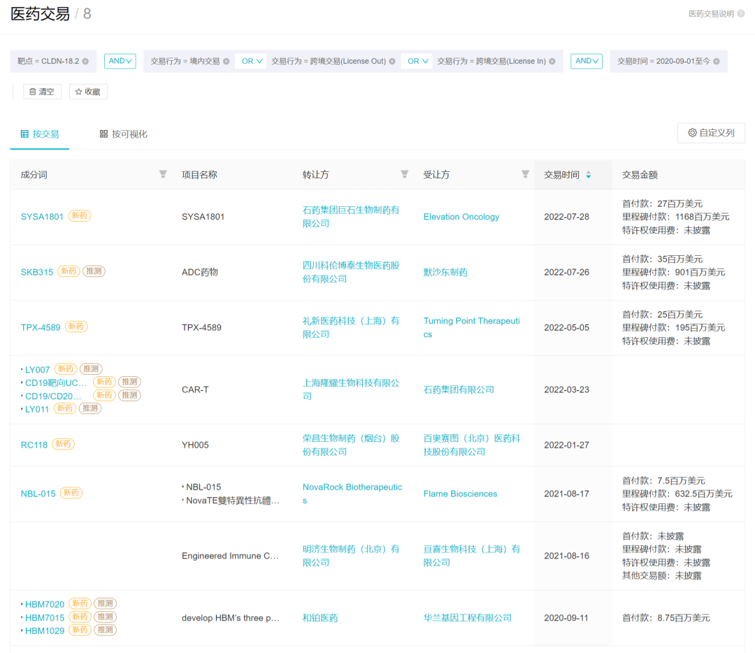就 Claudin 18.2 靶向药而言,由于存在差异化的竞争优势,这两年就至少发生过 8 次国内企业相关的医药交易,尤其 License out 交易更是频频爆发。