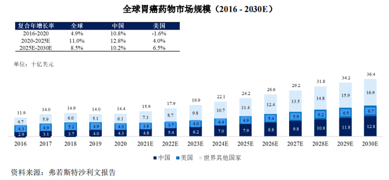 根据弗若斯特沙利文报告,2016 年至 2020 年,全球新诊断胃癌病例从 98 万例增至 108.9 万例(包括中国约 47 万例)。预计到 2025 年,全球新胃癌患者发病总数将达到 125.6 万(包括中国约 54.6 万例),到 2030 年将达到 143.5 万(包括中国约 62.2 万例)。