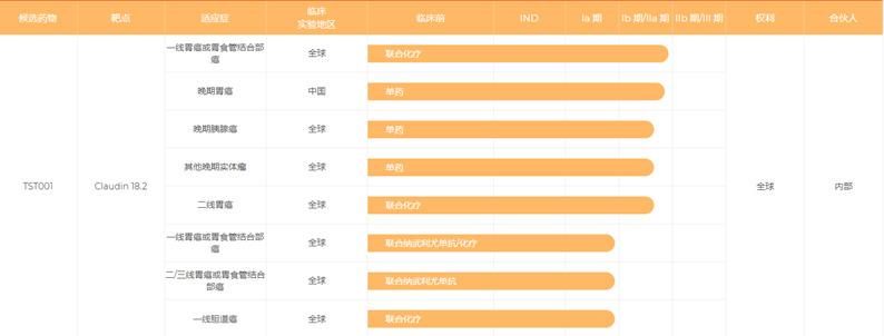 2022 年中报显示,今年 2 月,TST001 联合顺铂及吉西他滨用于一线治疗的局部晚期或转移性胆道癌(BTC)患者的中国 IIa 期研究成功完成首例患者给药;3 月,创胜与 BMS 合作开展评估 TST001 联合欧狄沃®(纳武利尤单抗)用于一线胃癌/胃食管连接部癌的全球临床试验。
