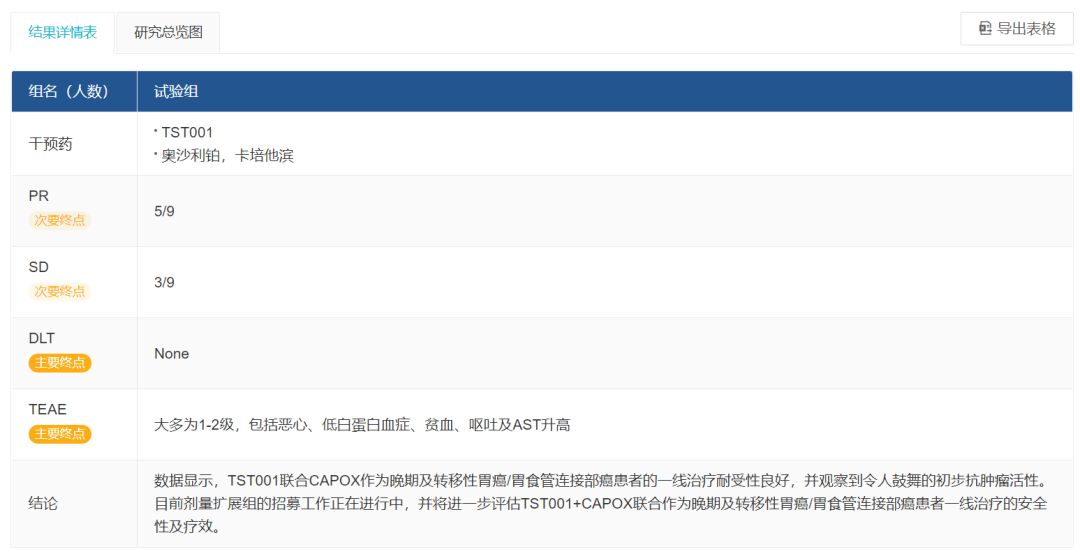 2022 年 6 月,创胜集团在 ASCO 年会上展示了 TST001 联合 CAPOX 作为晚期或转移性 G/GEJ 癌一线治疗的 I 期临床研究剂量递增部分的临床数据,并观察到耐受性良好及令人鼓舞的初步抗肿瘤活性。在 9 名可评估的给药患者中,5 名实现部分缓解及另外 3 名实现病情稳定。