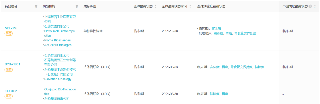 石药集团研发的 Claudin 18.2 ADC 药物 SYSA1801 用于治疗胰腺癌、以及 Claudin 18.2 单抗药物 NBL-015 用于治疗胃癌(包括胃食道结合部癌)的适应症均在 2021 年度获得 FDA 授予孤儿药资格,后又双双实现对外授权,目前两款药物均处于临床 I 期阶段。此外,石药还有一款 ADC 药物 CPO102 在研。